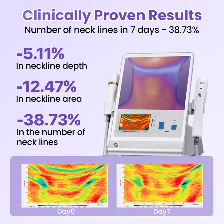 Sem agulhas, sem cirurgia, sem procedimentos invasivos - alcance um rejuvenescimento da pele com qualidade de spa no conforto da sua casa! Estudo clínico de 7 dias | 1.000 participantes | Todos os tipos de rugas no pescoço. A análise avançada da pele VISIA confirmou resultados notáveis em apenas uma semana: